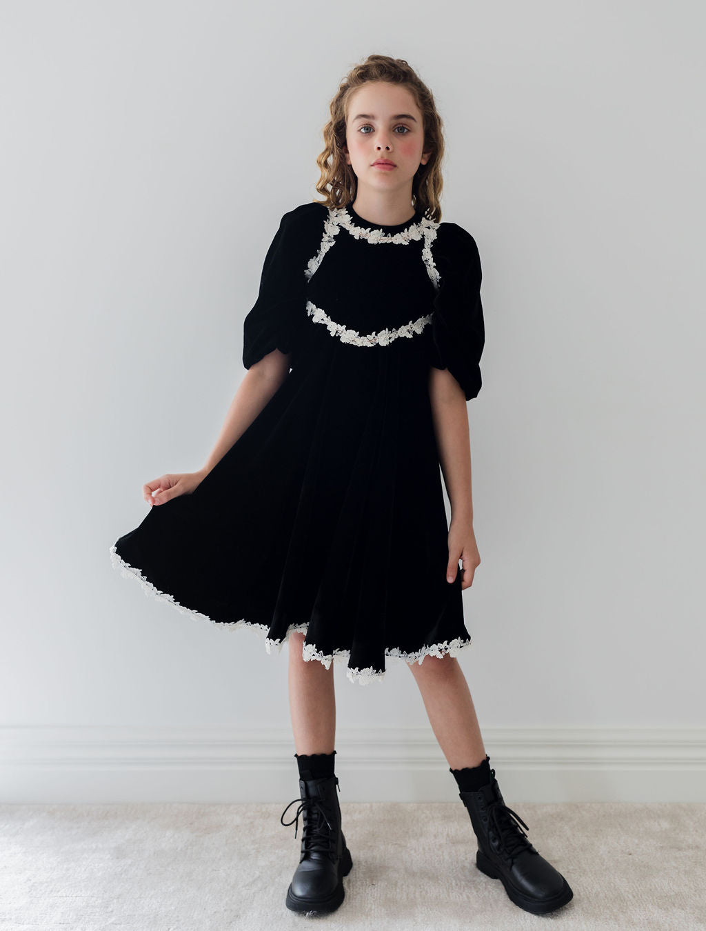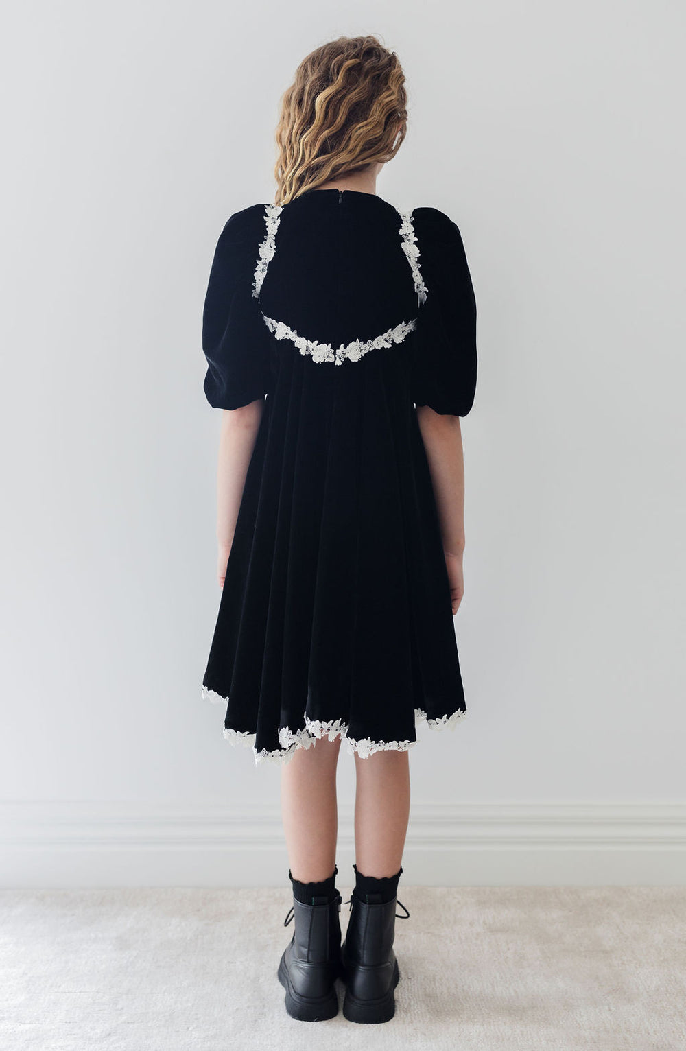 Preorder 1371-Rose Lace Velvet Dress-Black/Cream